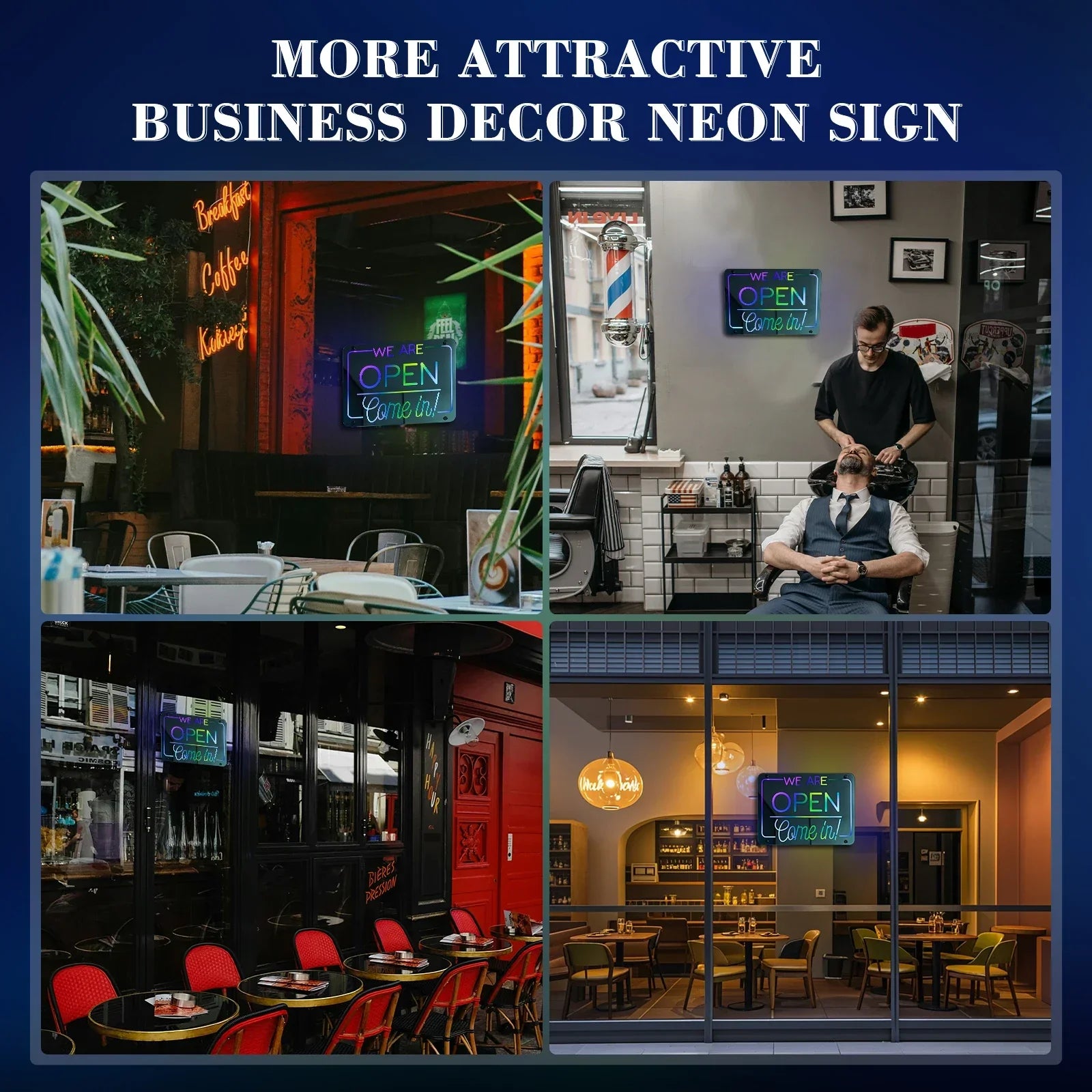 Transform your storefront and lure customers in with the ultimate "WE'RE OPEN - Come In" LED Sign. This isn't just any open sign; it's a mesmerizing **RGB infinity mirror** that creates a captivating visual tunnel effect, guaranteed to grab attention. Powered conveniently via USB, it offers a spectrum of vibrant colors and dynamic lighting modes to perfectly match your brand or mood.